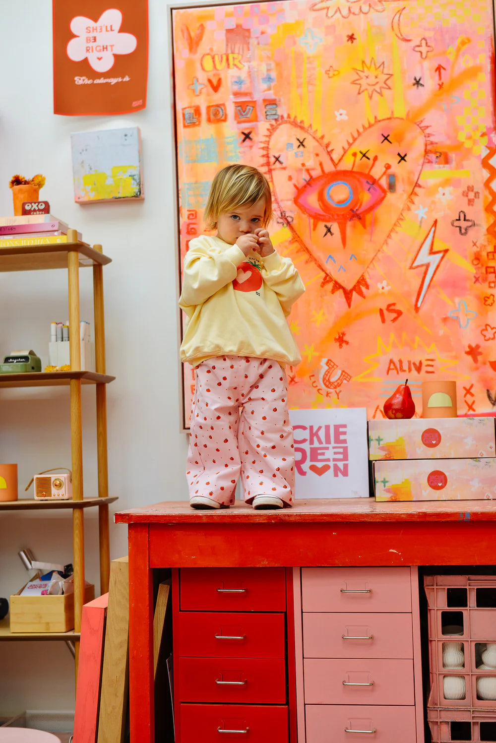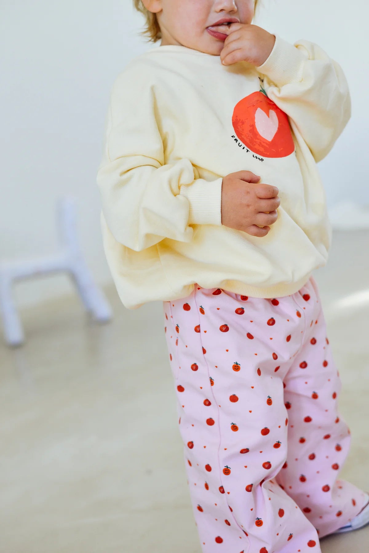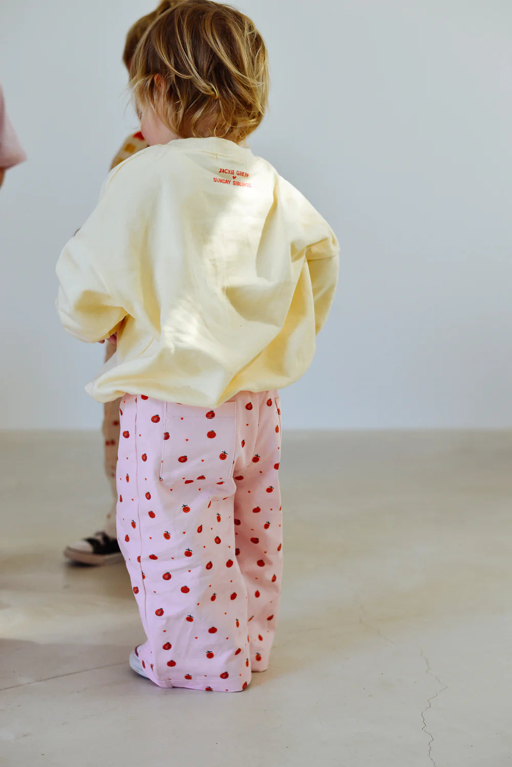 Sunday Sibling's new Fruit Loop Pants are 100% canvas cotton. Elasticated waist band and length for your little one to grow into. Artwork by the incredible Jackie Green and graphic created by SS's very own Aaron Winsbury.